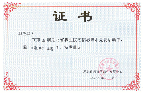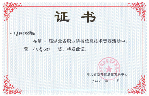 新闻网讯 近日,湖北省教育信息化发展中心表彰了湖北省第三届职业院校信息技术竞赛获奖单位及选手,我院计算机工程系学生张旭海同学获高职中文类三等奖,经济贸易系学生徐金凤同学获高职英文类三等奖,计算机工程系学生邓浇华、黄芳、王芳、经济贸易系学生管海翠、林宽同学获高职中文类优秀奖,十堰职业技术学院获优秀组织奖。