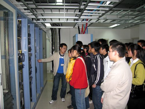 3月6日、7日、10日、11日,在该系主任夏德洲的带领下,计算机工程系分批组织了计算机应用、网络维护、图形图像、信息管理4个专业的大一学生到十堰市财政局信息中心、中国电信十堰分公司网络数据中心进行了观摩学习。同学们除观看十堰市最先进的网络设备设施、作用、运行情况外,还聆听了那里的技术人员现场演示和讲解。每到一处,随学生同行的,还有相应教研室的全体老师。