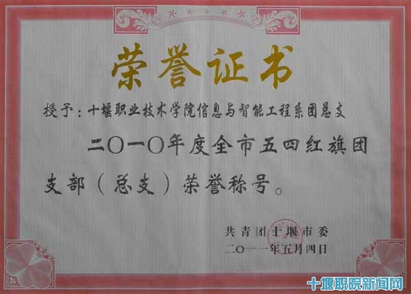 新闻网讯(通讯员 张玲 学生记者 陈伦龙)5月3日,共青团十堰市委对全市2010年度涌现出来的先进团组织和优秀个人进行表彰。我院旅游与涉外事务系团总支、信息与智能工程系团总支被评为“五四红旗团支部”;电子工程系团总支书记罗时髦、生化与环境工程系团总支书记雷一鸣、经济贸易系团总支书记杨波被评为“优秀共青团干部”,华国玉等六名同学荣获“优秀共青团员”称号。