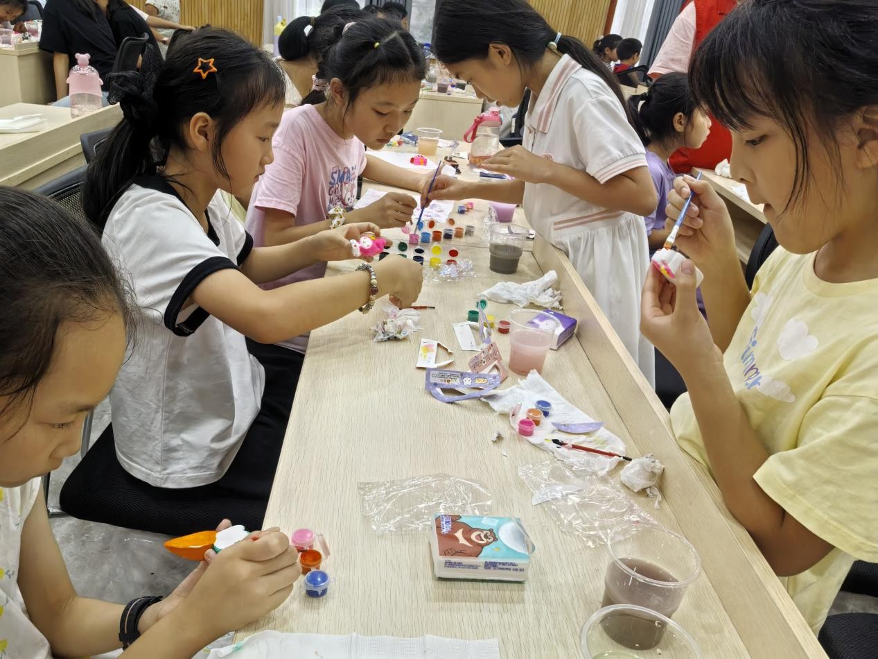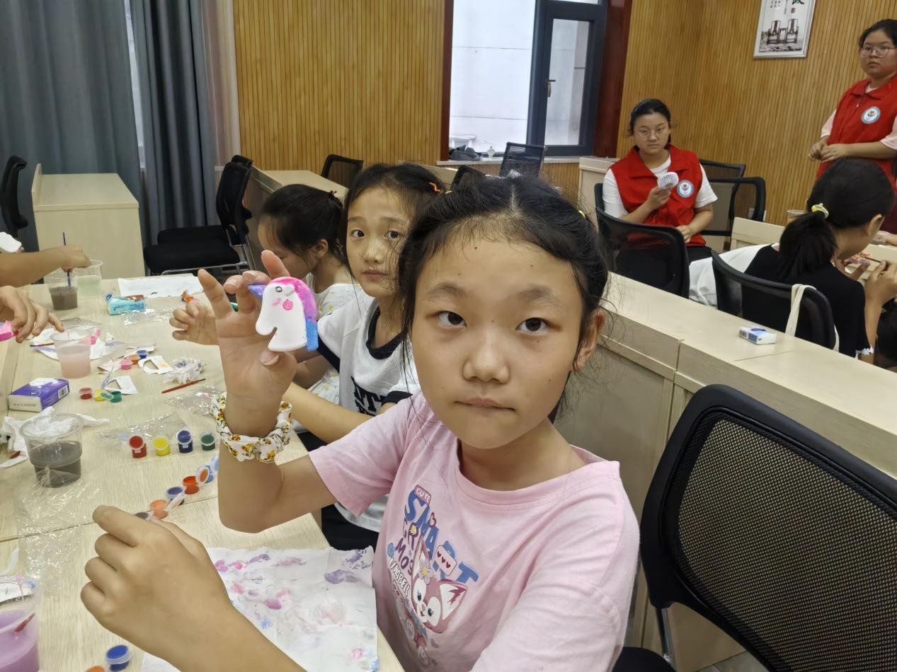 活动接近尾声,原本素净的石膏娃娃被赋予了鲜活的色彩:戴着粉色蝴蝶结的兔子、身披彩虹披风的超人、缀满星星的太空人……孩子们举着自己的作品互相展示,脸上洋溢着成就感。志愿者杨韵涵表示:“希望通过这样的活动,给社区孩子们带去快乐,也让志愿服务‘电亮’更多角落。”